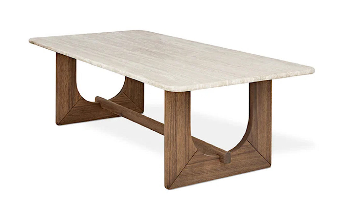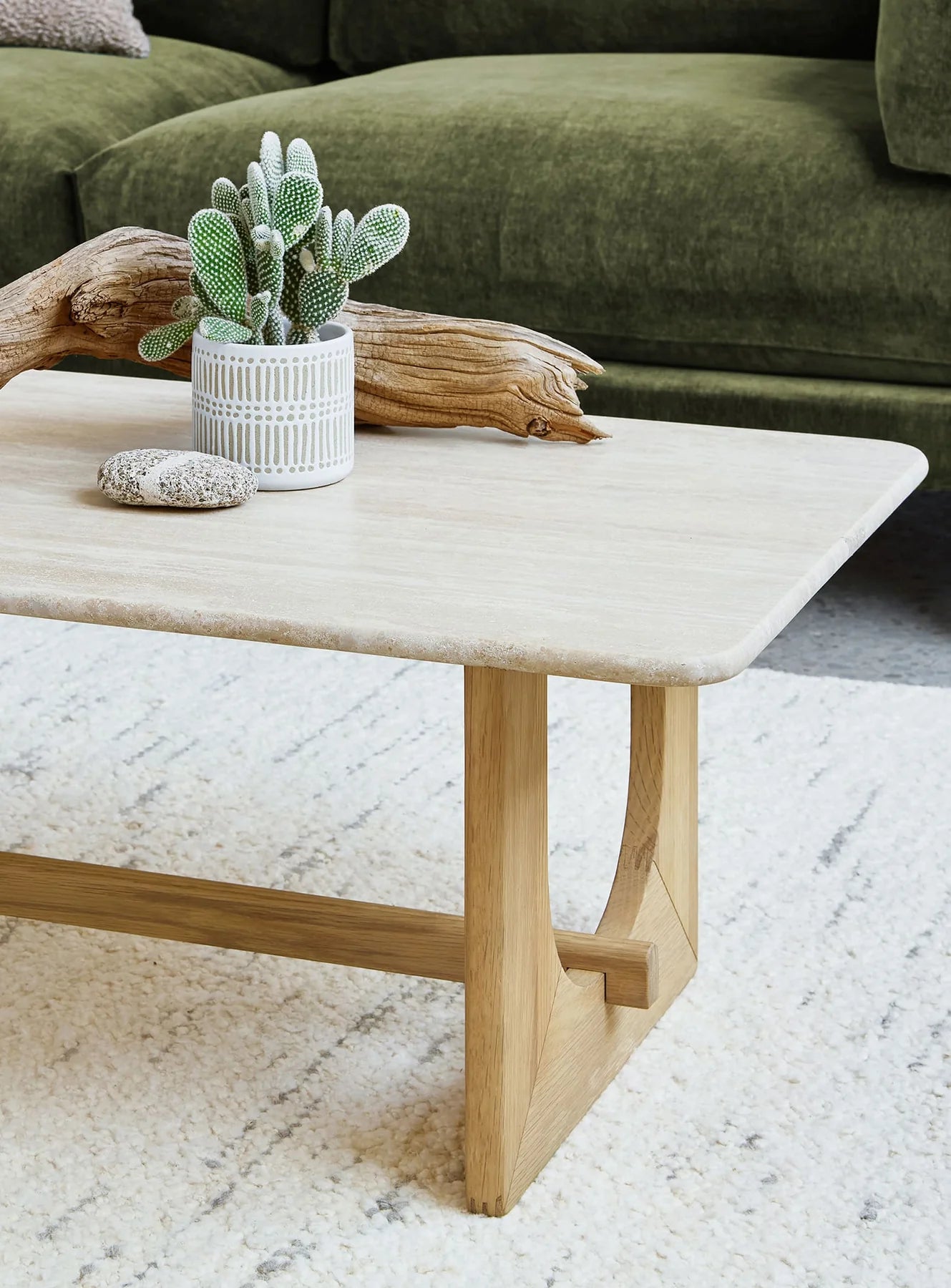 The Portico Coffee Table showcases an alluring travertine slab surface and elegantly crafted solid wood base in Walnut or White Oak. The warm, natural travertine grain creates an organic beauty that is unique to each design, reinforced by gently curved corners. These curves are mirrored in the base - with graceful forms and thoughtful proportions that blend the materials into a unified, sculptural accent. The Portico Coffee Table is available in square or rectangular size. Also available as an End Table.