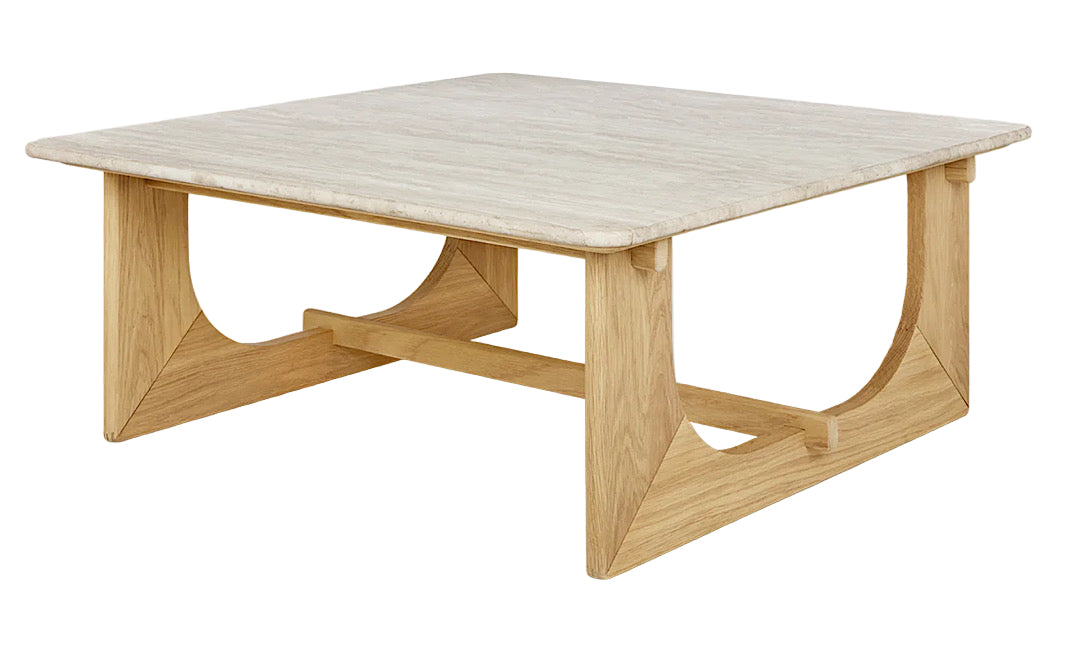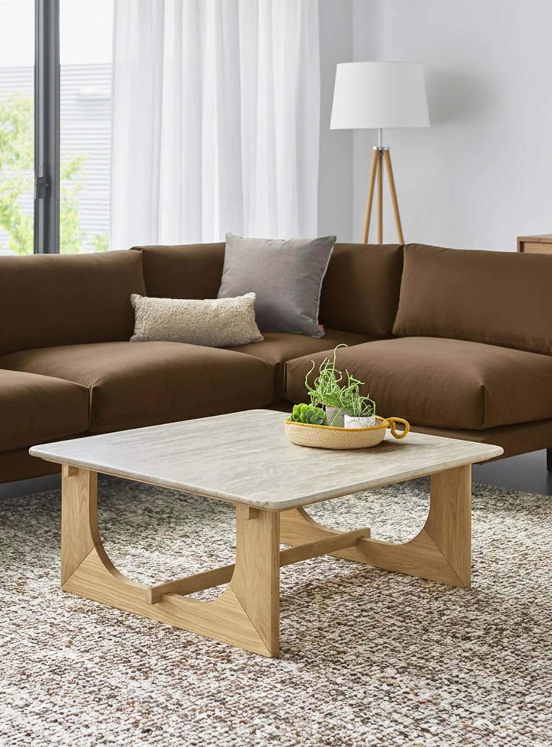 The Portico Coffee Table showcases an alluring travertine slab surface and elegantly crafted solid wood base in Walnut or White Oak. The warm, natural travertine grain creates an organic beauty that is unique to each design, reinforced by gently curved corners. These curves are mirrored in the base - with graceful forms and thoughtful proportions that blend the materials into a unified, sculptural accent. The Portico Coffee Table is available in square or rectangular size. Also available as an End Table.