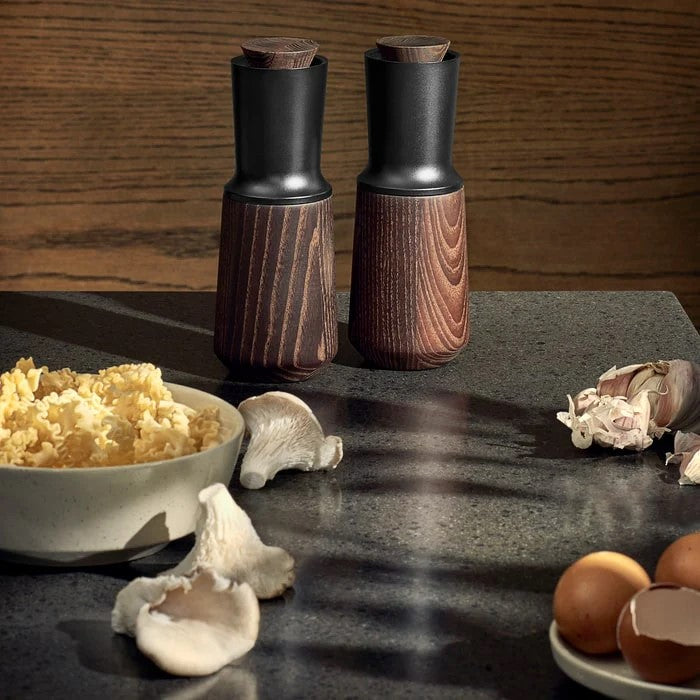 The kitchen series RÅ is designed in collaboration with chef Jesper Vollmer. In this range, focus is placed on useful, classic kitchen tools in quality materials and user-friendly Nordic design. This charming grinder can be used for both salt and pepper: the ceramic grinder is located at the top, to avoid a mess on the table. The rustic metal part fits well in the hand, and the cast iron texture creates a good grip. The grinder is suitable both in the kitchen and on the table, and it forms a great set with the saltcellar in the same series. The grinder is refilled simply by pulling the metal part upwards, and refilling the wooden part.