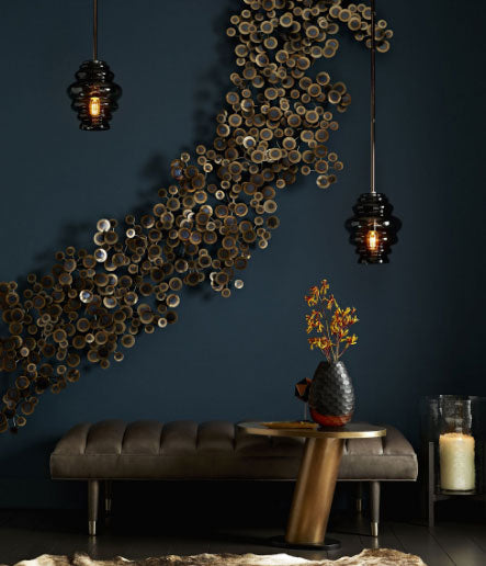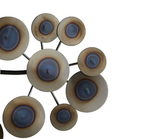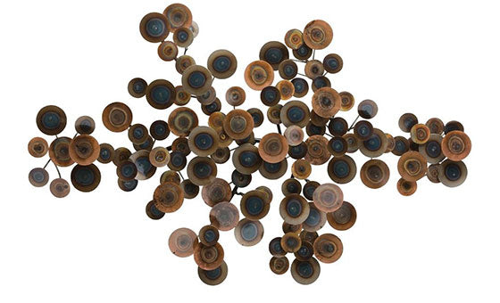 This iron wall art is made up of over 100 discs, each hand-burnt to create unique colorations, then welded together in a layered, freeform composition. Whether it's displayed horizontally or vertically, the result will be a one-of-a-kind play of light and shadow. The inspiration may be mid-century, yet this wall decor adds dimension and texture to any room.