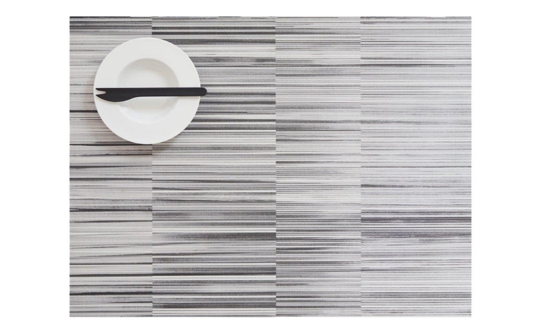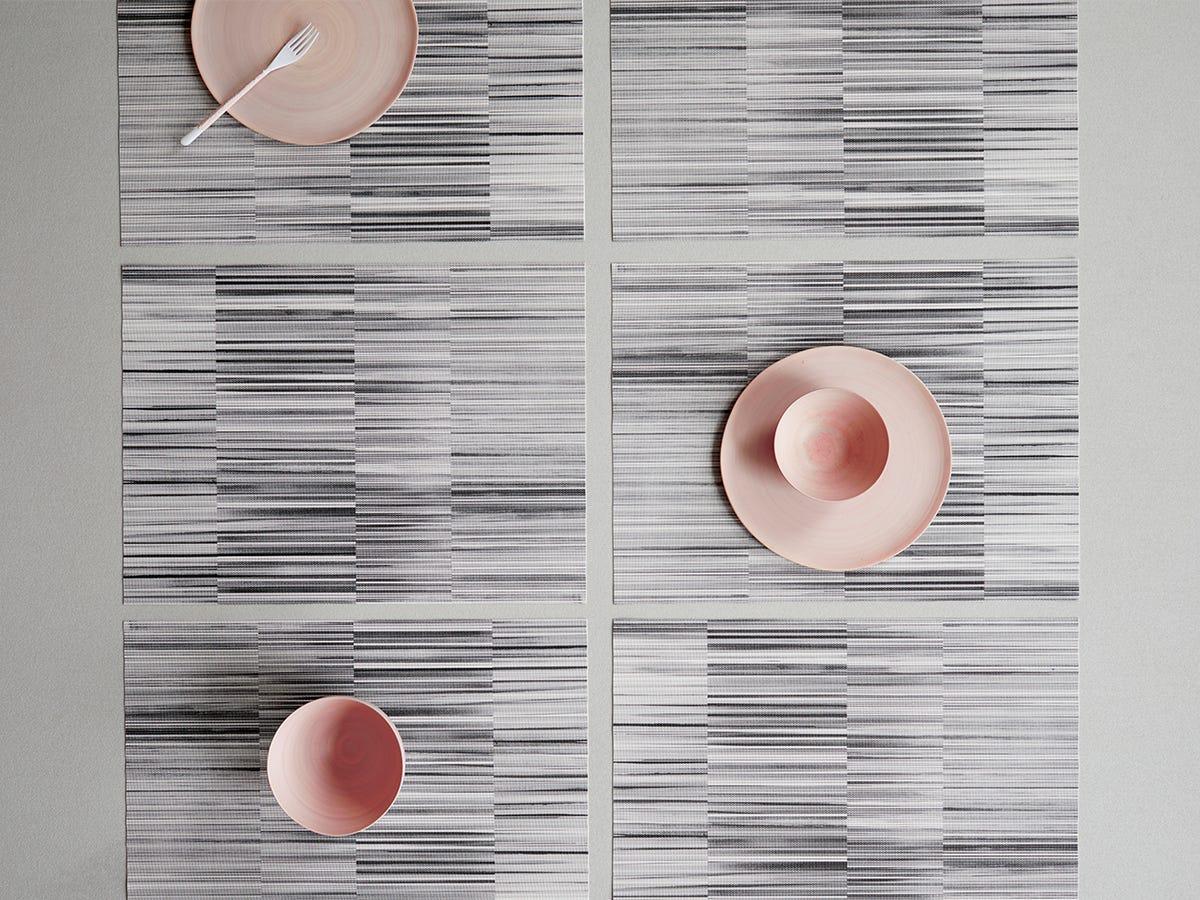 With its finely striped bands of varying widths and tones, this graphic design is a printed interpretation of the Japanese tradition of weaving scraps of old fabrics into sakiori textiles, from the word saku (to tear or rip) and oru (to weave). The Chilewich design team looked to antique sakiori textiles for inspiration and reimagined their intricate weave structures and lively lines in two dimensions with ink and paint.