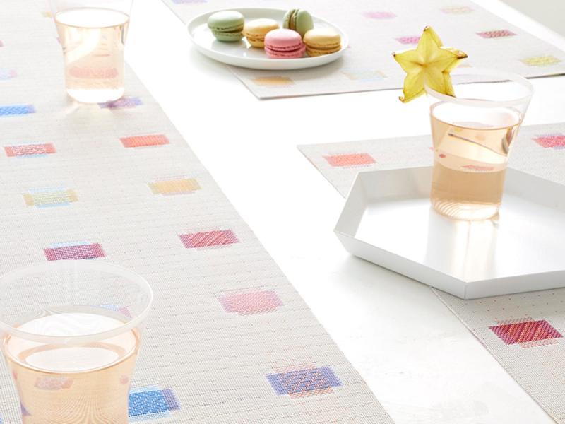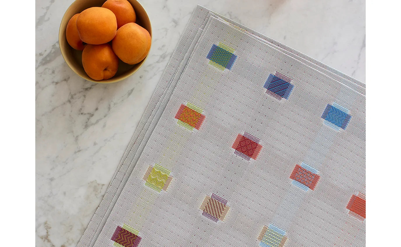 In Sampler, paired rectangles come together, introducing a distinctive weave as they overlap. This dynamic design is inspired by samplers that were used to learn and demonstrate darning: a sewing technique for repairing holes or worn areas in fabric by replicating the structure of the original material. Dating back to at least the 18th century, these samplers typically covered small pieces of cloth in darning "blocks" of various weave structures in a variety of colors—especially blue, green, red, and yellow yarns—to make intricacies visible and show the weaver's skill.