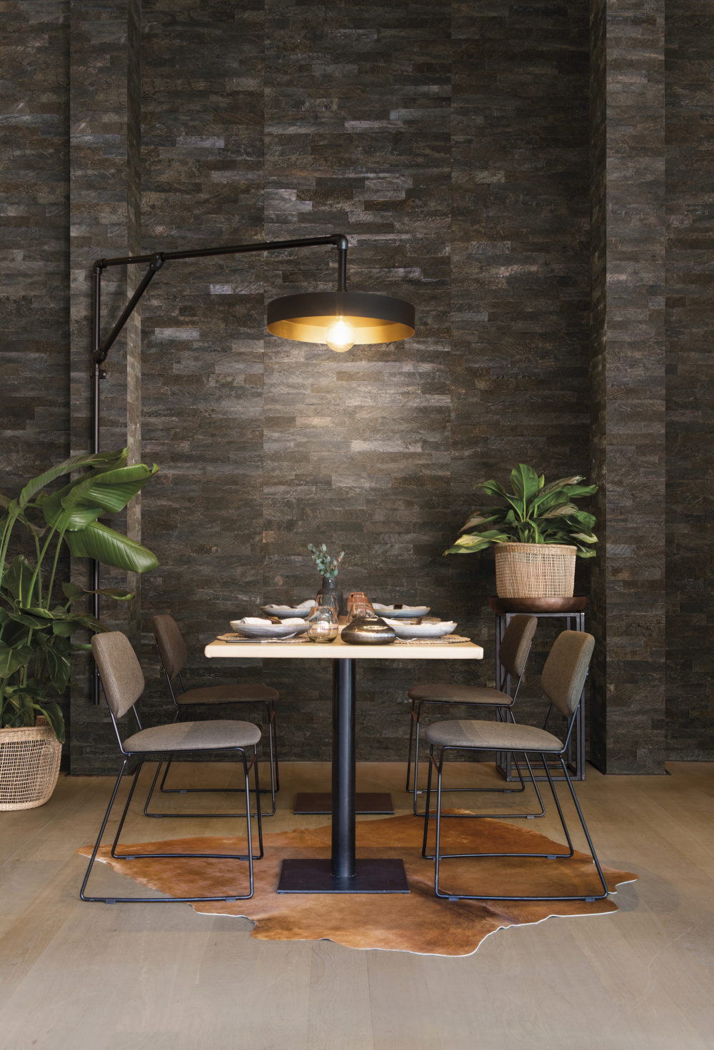 Coconut bark: the coconut tree, symbol of far-off tropical islands, is enveloped by bark that is striped, marbled and smooth yet coarse. Intense weathering adds beauty to the material with a harmony of tones softened by the elements.