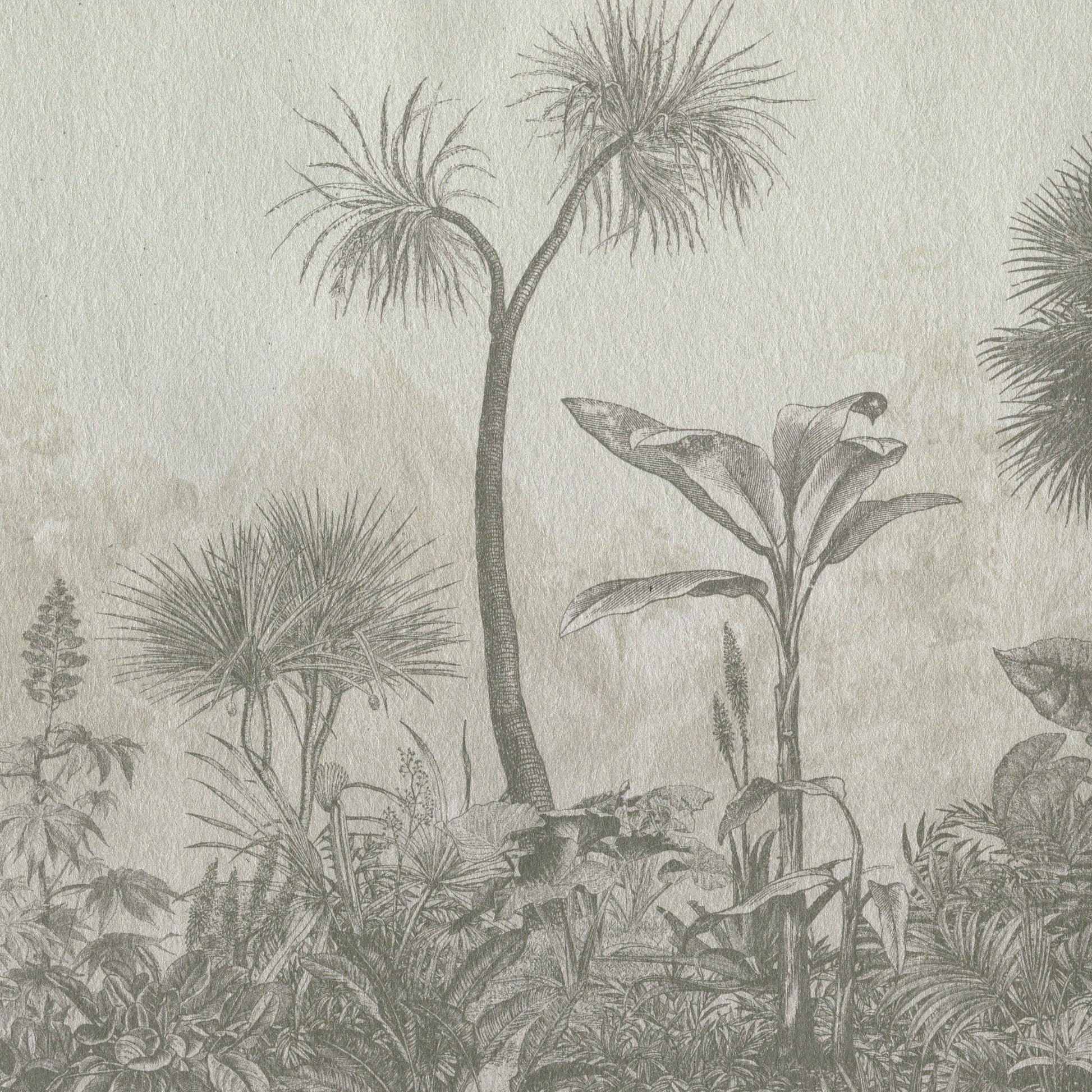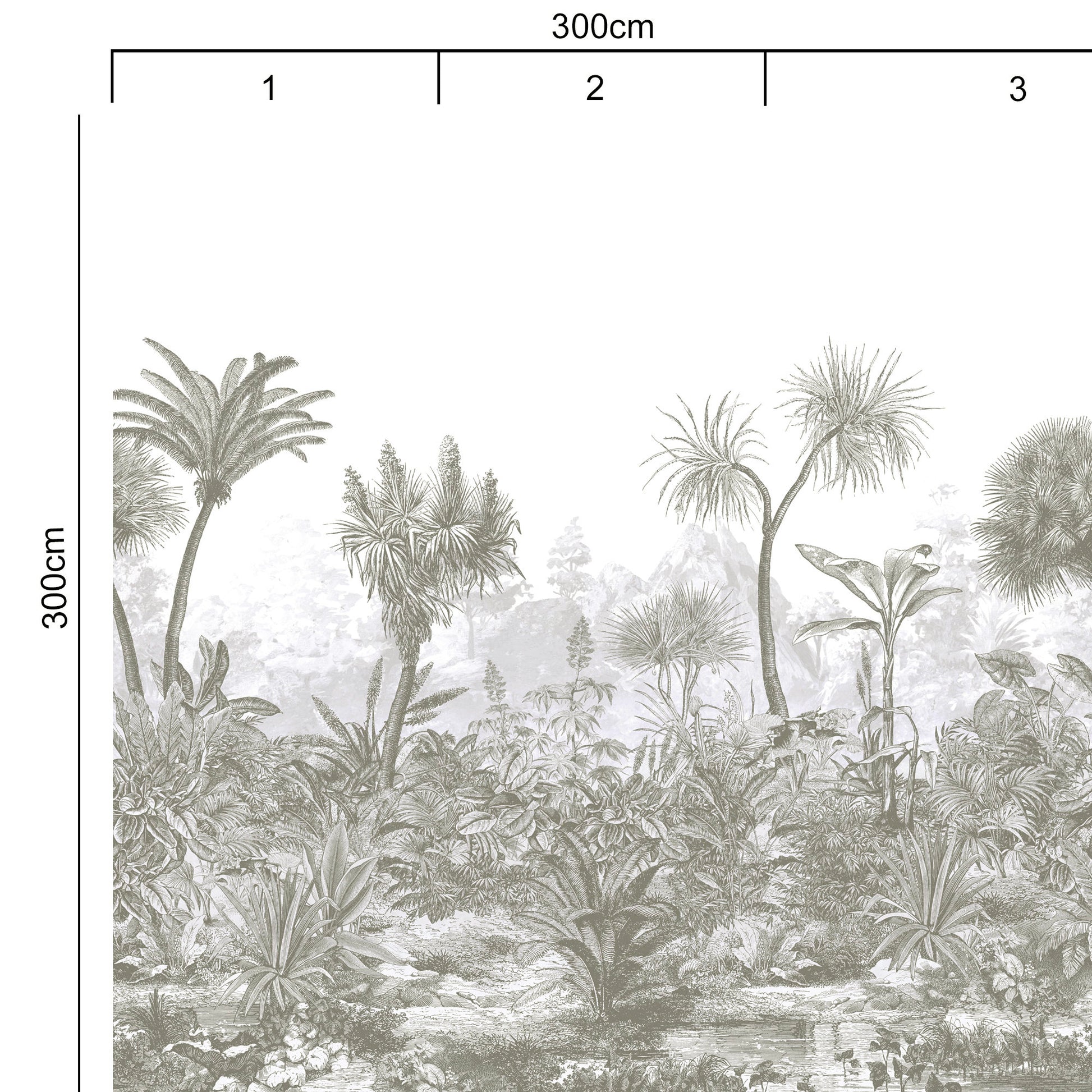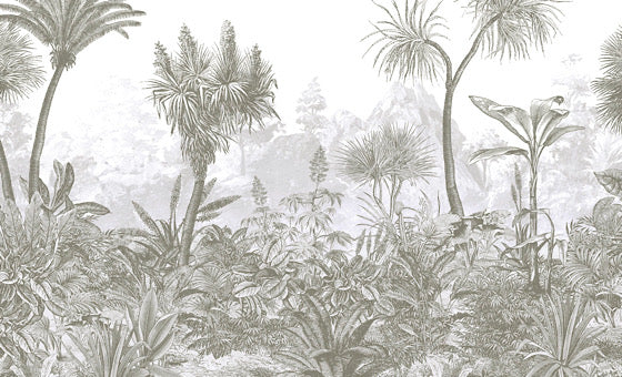 This 3 panel, extendable mural features a scene of tropical foliage and faded mountains in the distance. All in a taupe line-art style etch on soft beige ground.