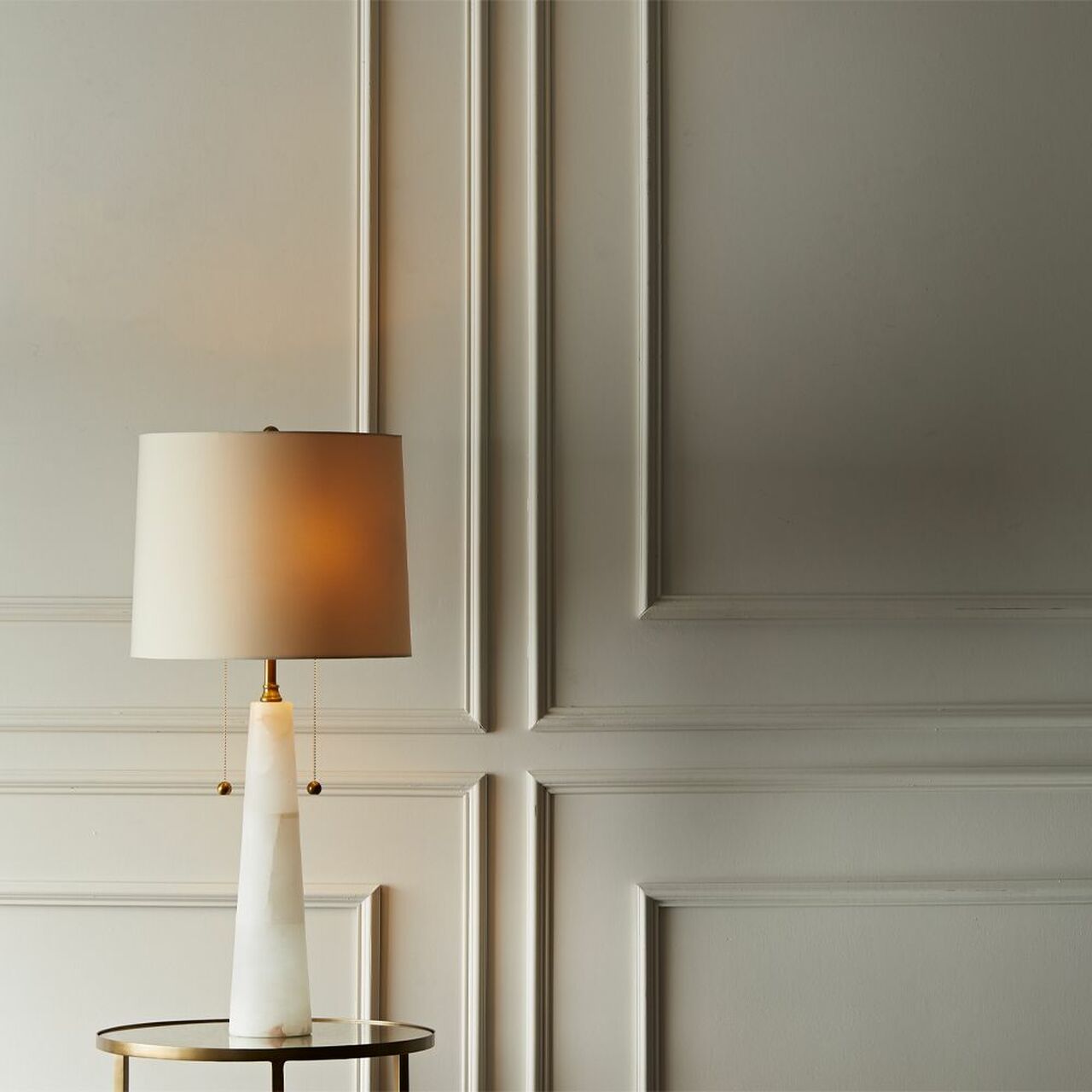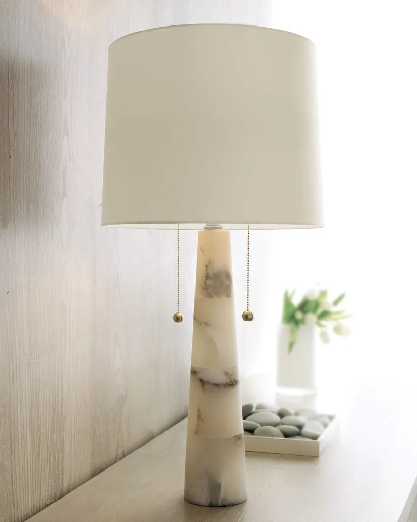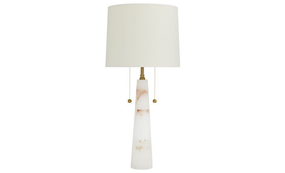 The Arteriors Home Sidney Table Lamp features a snow marble base with striking white striations, giving it a strong, natural look. Its double socket, modern table lamp design is completed by decorative brass pull chains, matching finial, and a putty-colored hardback shade. Add this beautiful lighting on an occasional table between two chairs in the living room, on the buffet in the dining room, or on the desk in your home office!