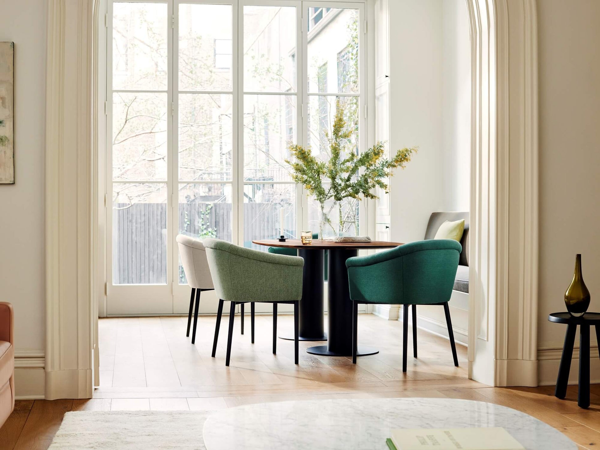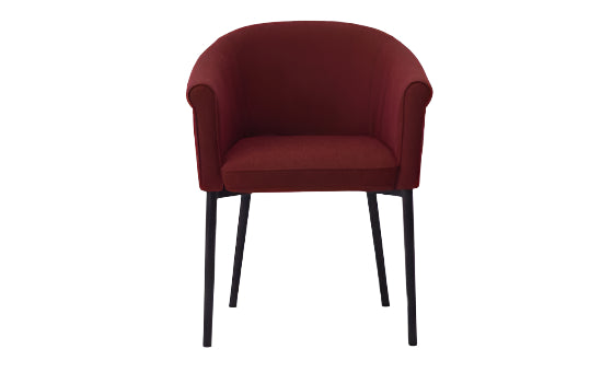 Part of the slope collection, the Slope dining chair takes inspiration from the classic chesterfield, presenting rolled arms organically outlining the frame. Upholstered to your choosing with black steel legs. Visit us in store to see more options.