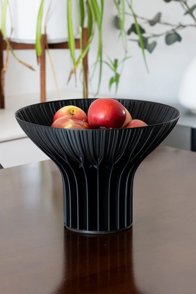 The Solstice fruit bowl is the elevated version of the Radiant bowl. The height adds to the tiny architectural drama and creates a more dynamic tablescape. These raised platforms are designed to allow air to circulate around your fruit to keep it fresh for longer. Celebrate the seasonal harvest with this centrepiece.