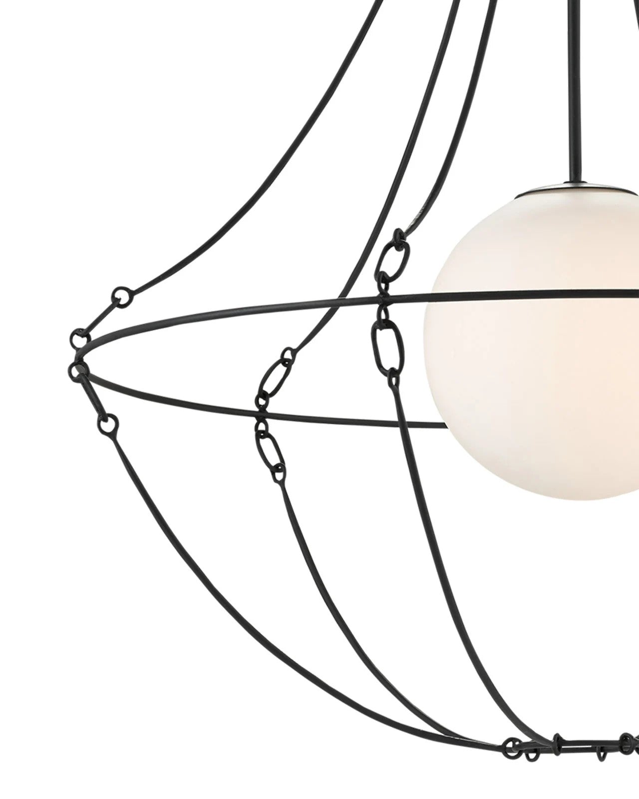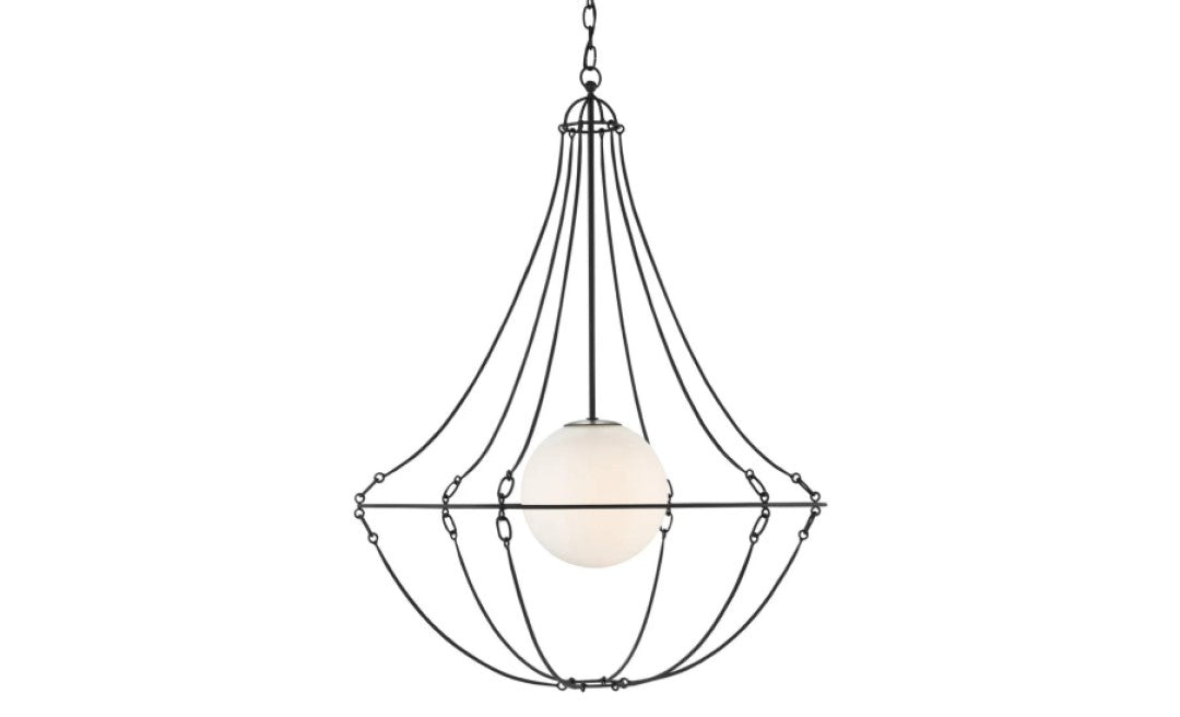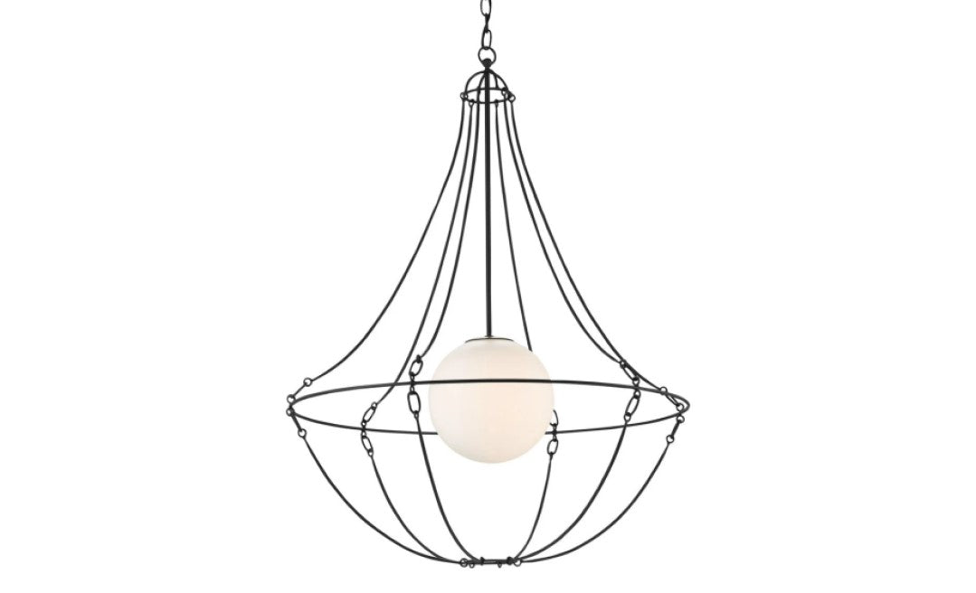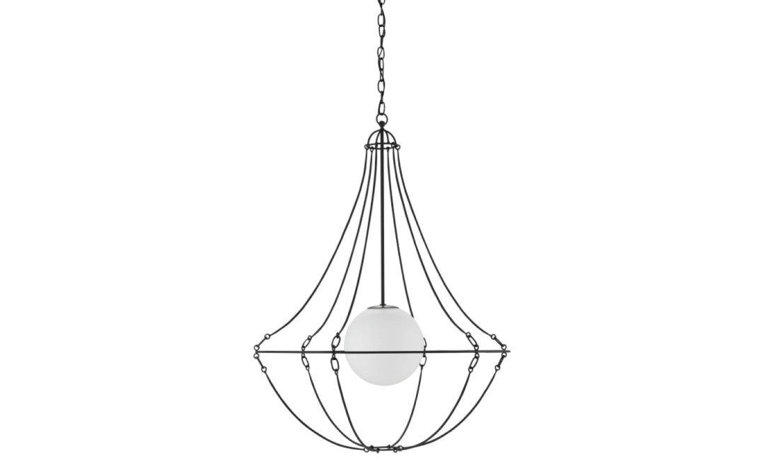 Tom Caldwell says the idea behind the Stanleigh Pendant was taking a familiar hand-forged, bell-shaped frame and making it very light. Using light-weight iron rods, our artisans have created a wonderful example of a handmade product. The individual rods are linked together to create the shape of the black pendant, which is lit with a milk glass interior globe.