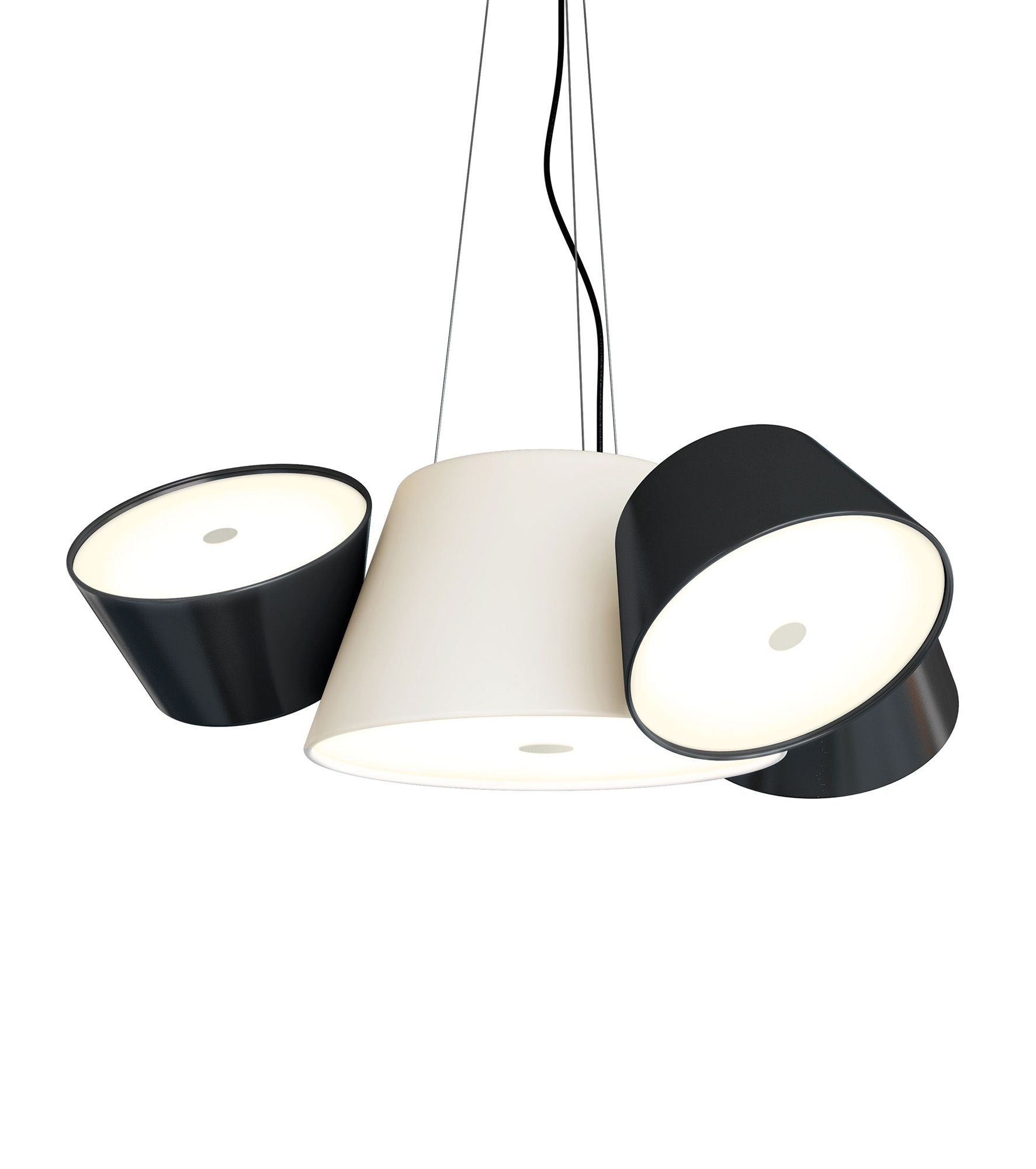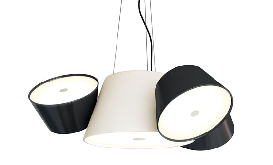 The Tam Tam consists of a central in lacquered aluminum, to which are attached various satellite shades which can be rotated through 360º by means of a swivel mechanism. An opalescent, methacrylate diffuser over the open end softens the light.