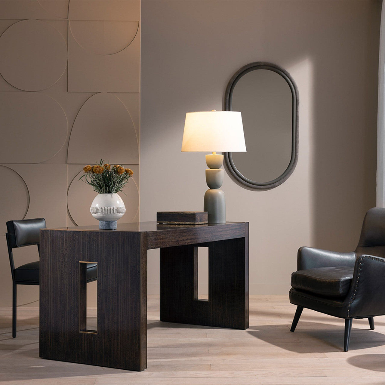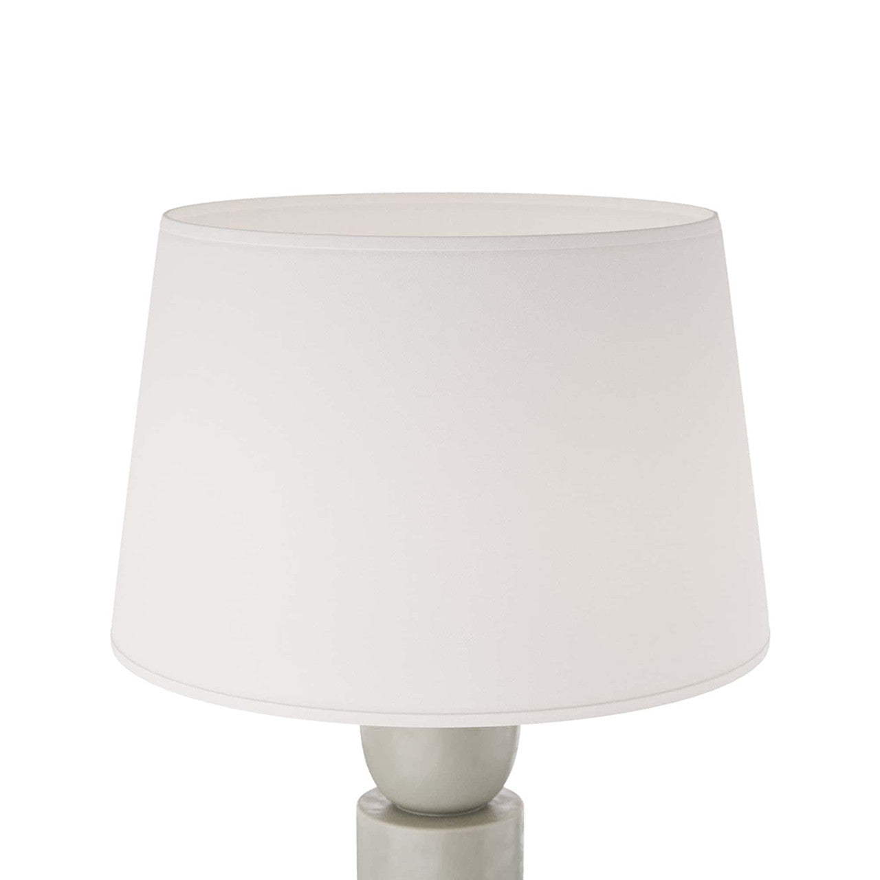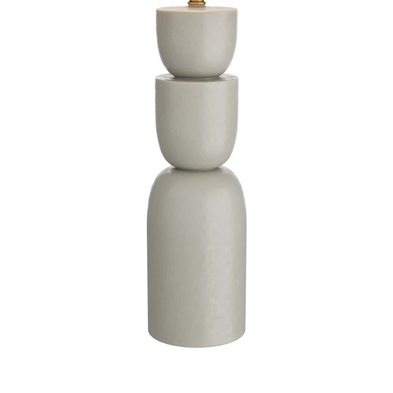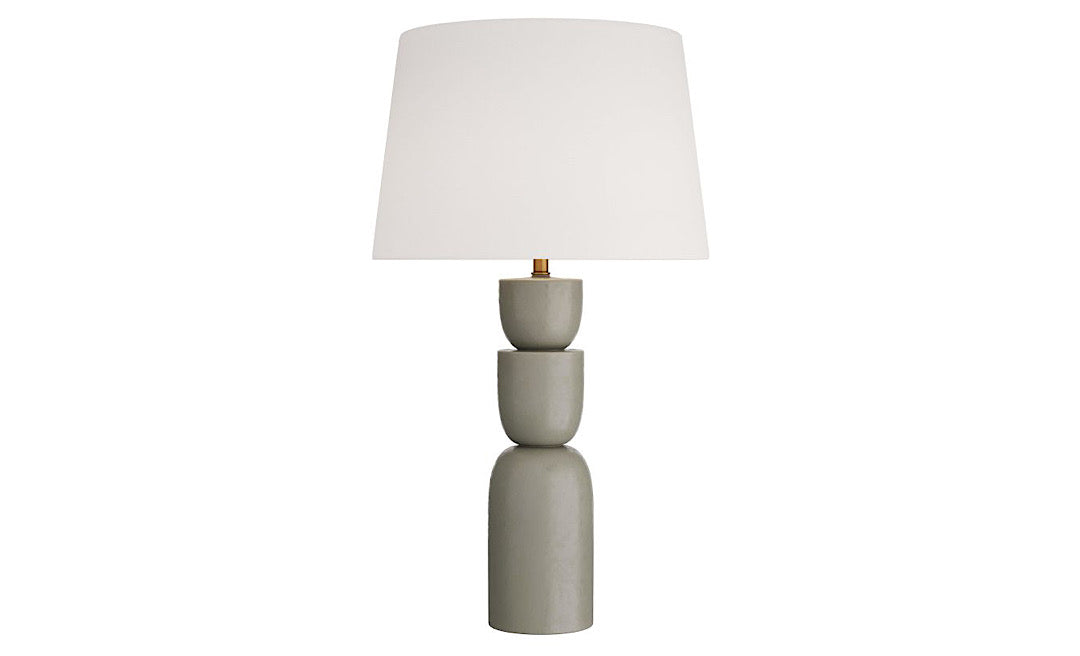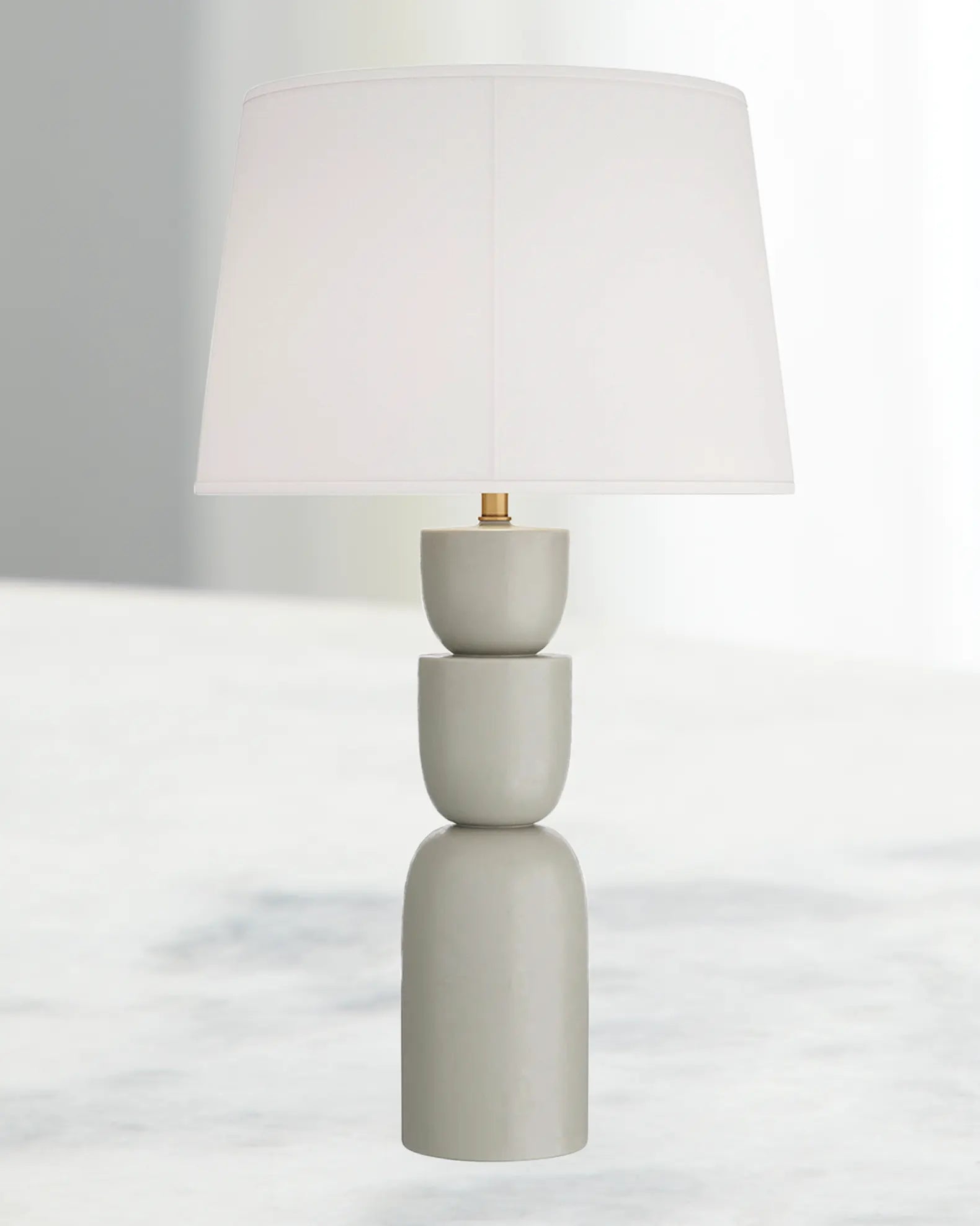 The Tasha lamp is crafted in a totemic design that mimics the stacked cup forms seen in Japanese garden fountains. With an inspired, artisanal sensibility, the table lamp is rendered in a trout porcelain, making it easy to incorporate into any space. The lamp is topped with a matching sphere finial and a tapered off-white linen shade, lined in off-white cotton. Finish will vary.