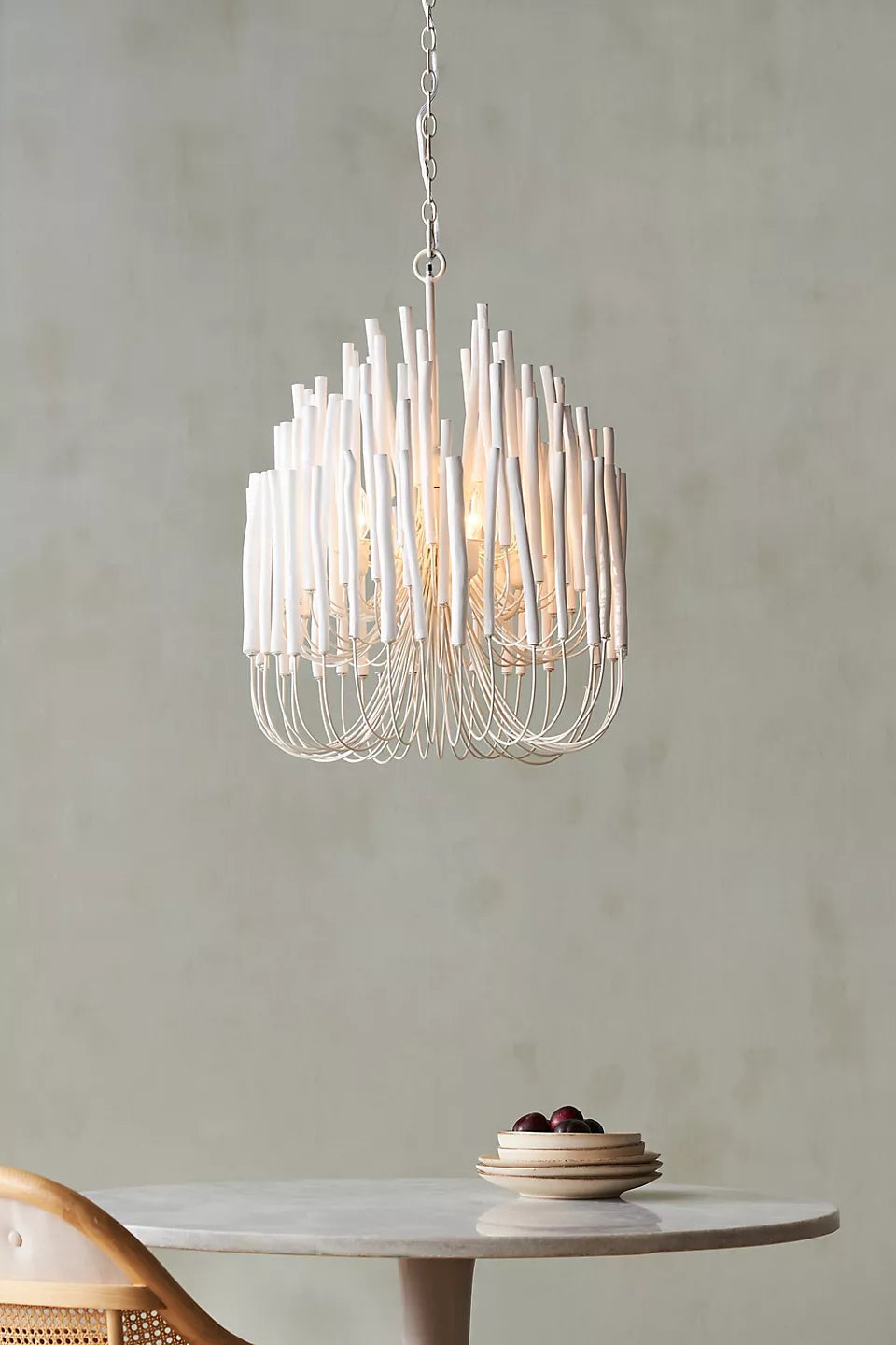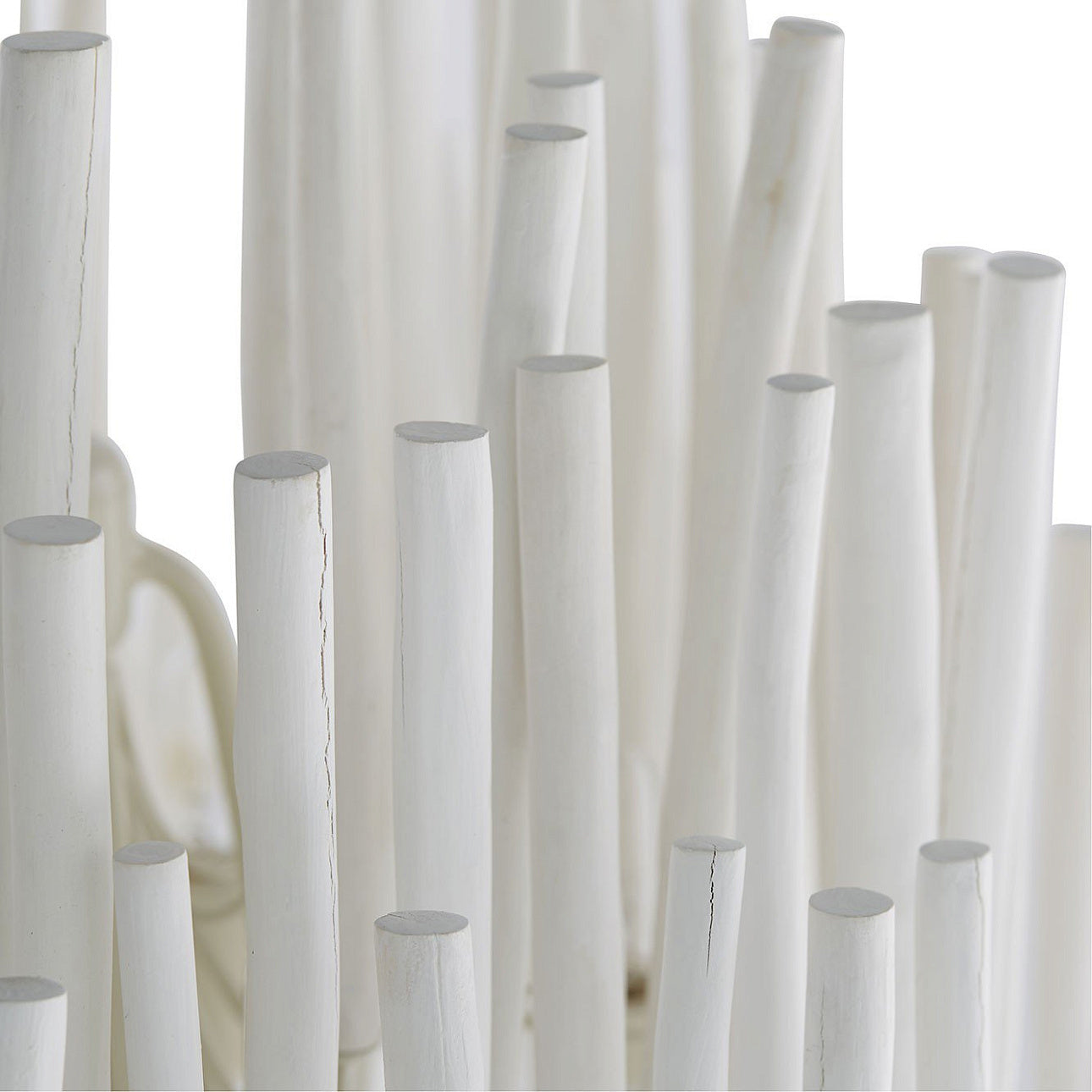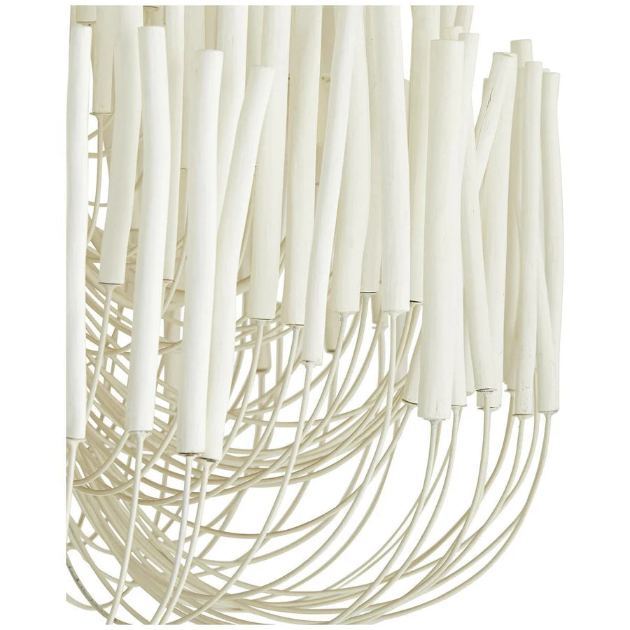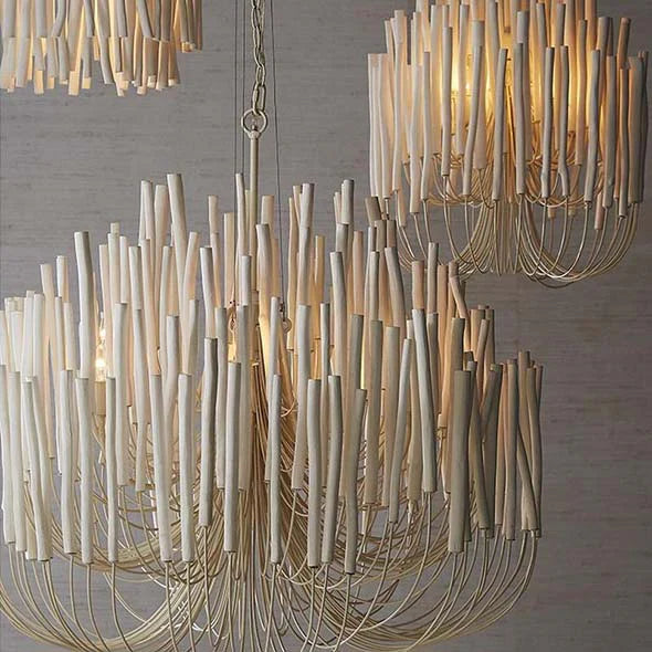 This rustically refined chandelier instantly transforms a space. The multi-tiered form features wooden dowels, finished in white, on curved and pliable iron arms. During installation, please ensure that all bulbs are not touching the dowels. If they are, gently press the arm one inch away from bulb to allow heat to properly disperse. Finish will vary. Due to the organic nature of the wood used to create this piece, each piece will vary in size and shape. The wooden sticks will eventually crack and is an inherent feature of solid wood of this proportion.