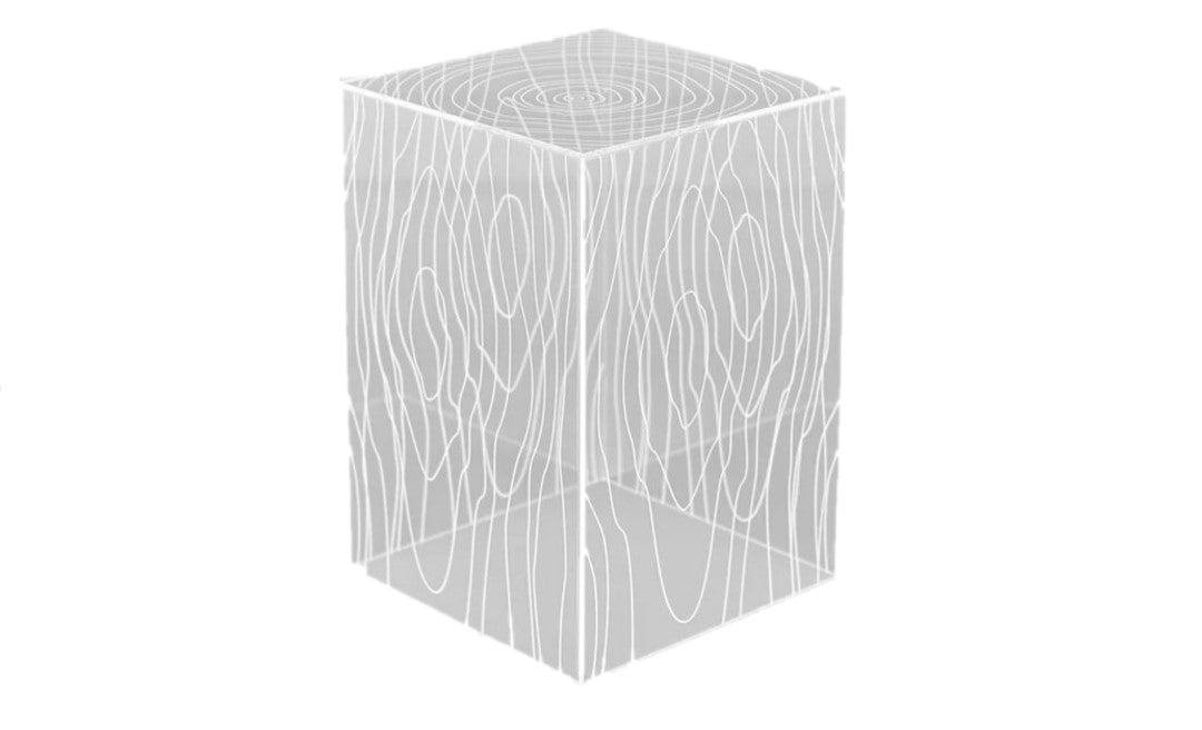 This accent table playfully fuses woodgrain patterns onto a five-sided acrylic box, juxtaposing organic lines with modern materials. The Timber Table is hollow, and can be flipped over to create an elegant storage piece.
