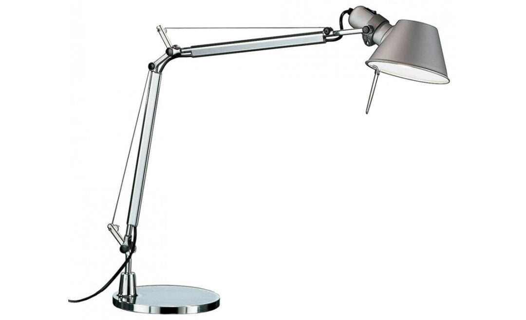 A version of the Compasso d'Oro award-winning table lamp from 1989, the Tolomeo Mini Table Lamp by Artemide continues the Tolomeo collection's decades-long tradition of mixing beautiful design and robust engineering. It is composed of a fully adjustable, articulated arm structure in extruded aluminum with a tiltable and rotatable diffuser in several aluminum finishes. An incorporated dimmer switch is located on the head, and stainless steel tension cables and springs are included.