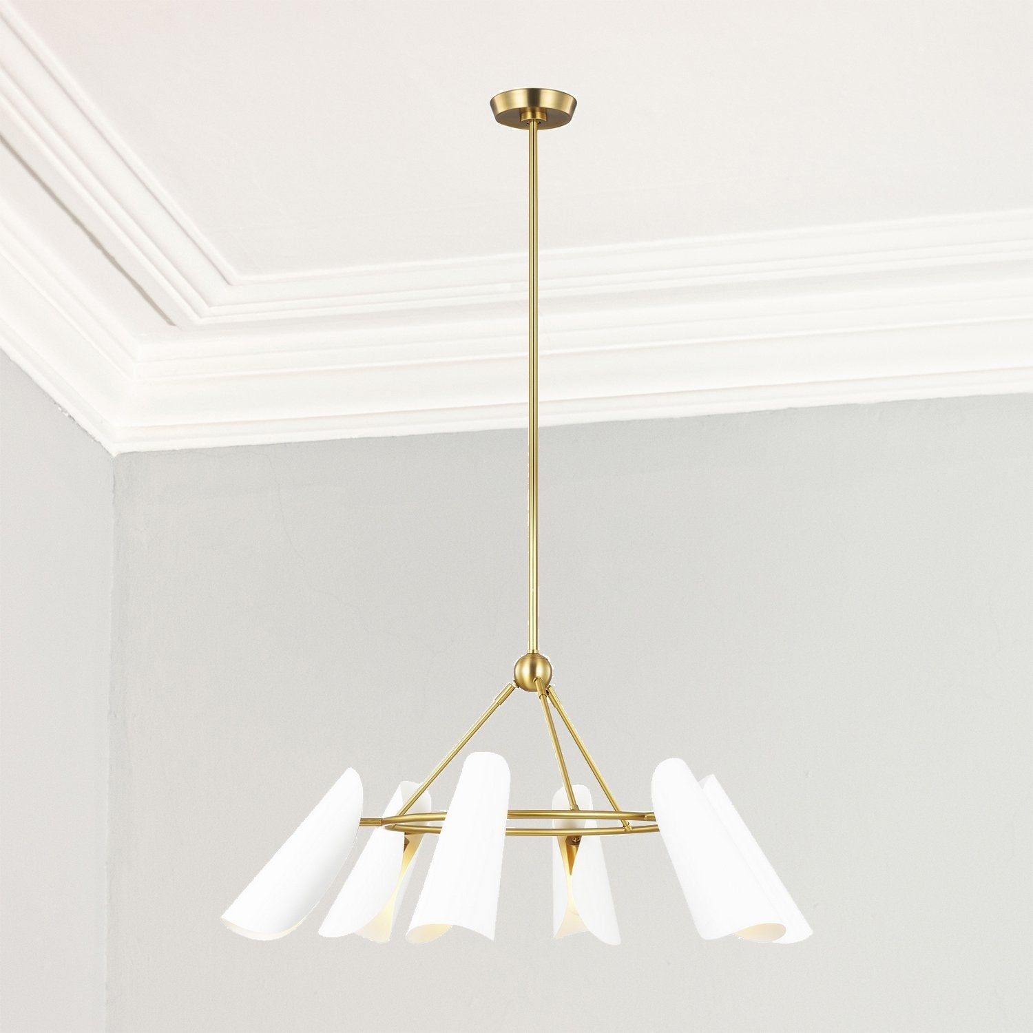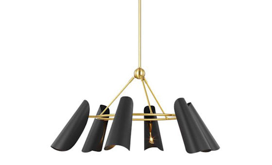 The Tresa six light single tier chandelier in burnished brass features a circular frame and six metal shades inspired by the shape of classic task lighting, focusing illumination downward. while the conical shades are designed with an open edge to allow additional light to pass through, as a contemporary twist. It’s mid-century modern influence creates a stylish focal point in large rooms.