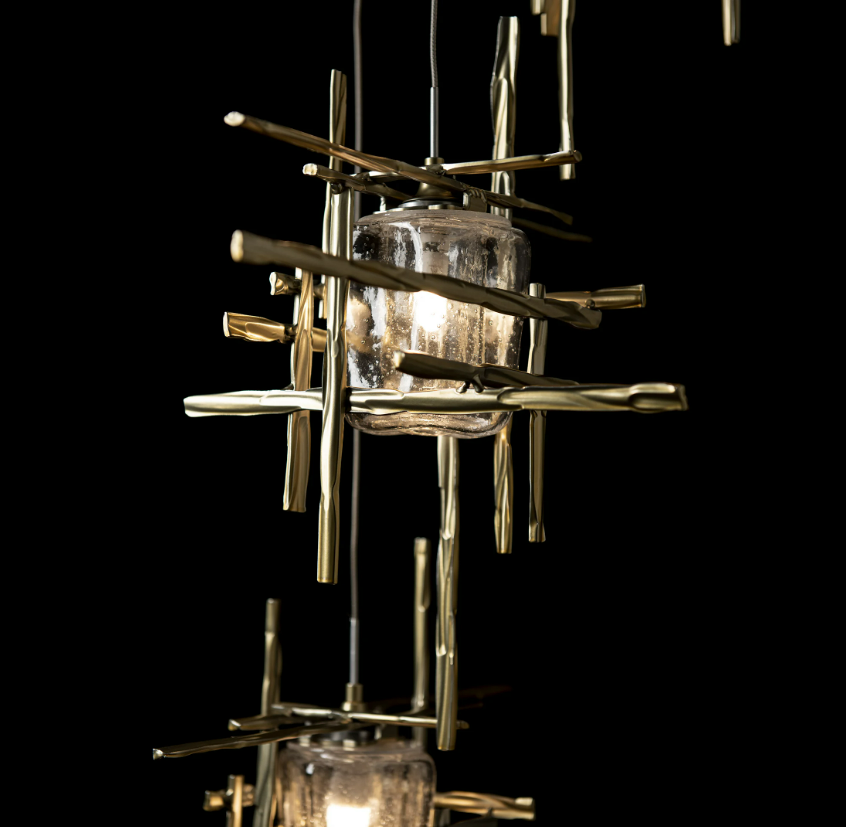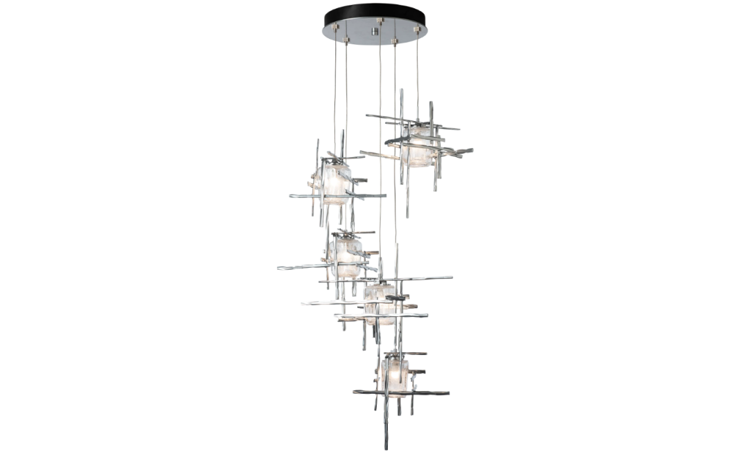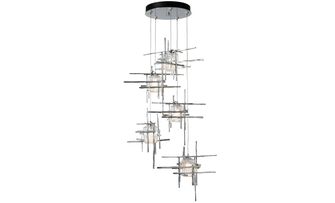 Thick, seeded clear glass shades are nestled within each of the Tura 5-Light Pendantβs modern, open, cage-like individual pendants. Perpendicular, intersecting pieces of hammered annealed aluminum, are painstakingly handmade with a trip hammer and dies by Vermont artisans. Easily customizable in length, the Tura is so versatile that you can feature it as a semi-flush or a longer pendant with cascading light with an easy cable adjustment.