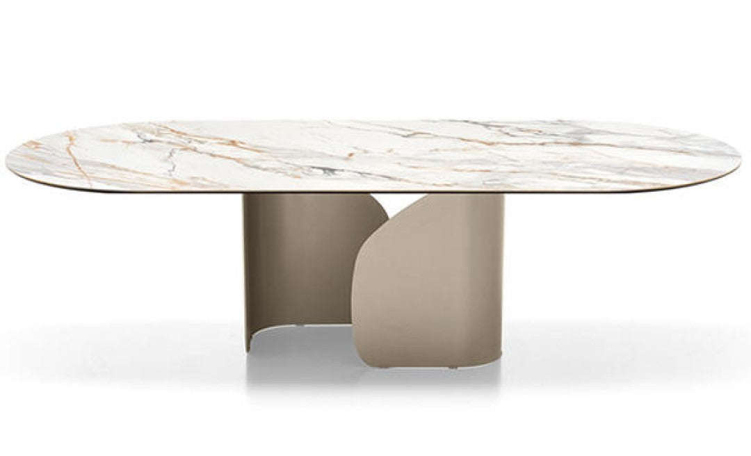 Twins is a dining table with a striking visual appeal, featuring a unique base composed of two curved, molded metal elements that create the illusion of the tabletop taking flight. With a wide range of finishes available, you can customize Twins to suit either a classic or modern aesthetic.