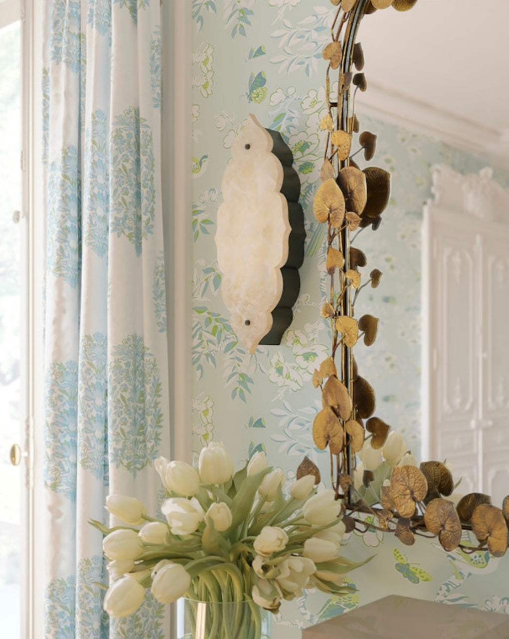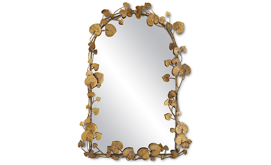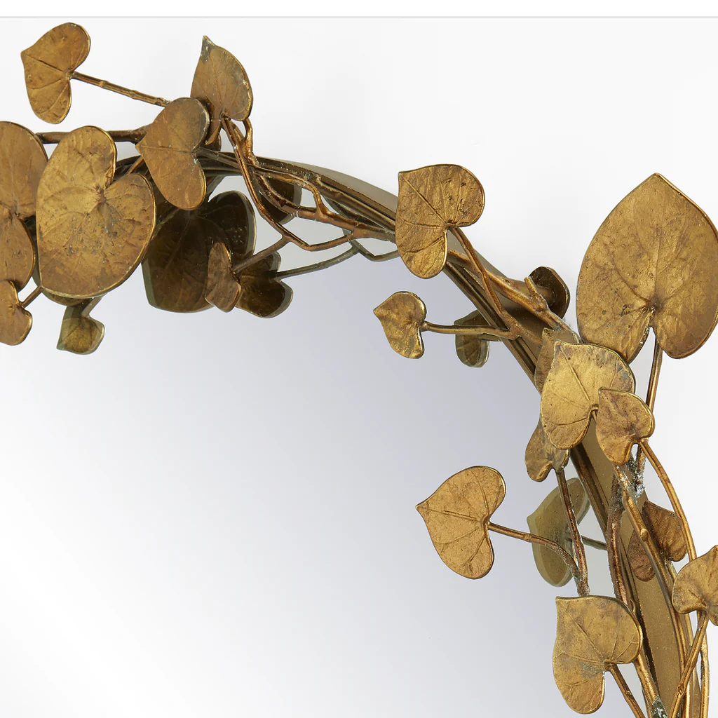 The vine of heart-shaped leaves flowing around the mirrored glass of the Vinna Arch Brass Leaves Mirror creates a playful display pulled straight from nature. The cast aluminum motifs in an antique brass finish have a subtle glow to them that makes this mirror a focal point on a wall. The vines are hand-shaped and the finish is hand applied on this decorative mirror.