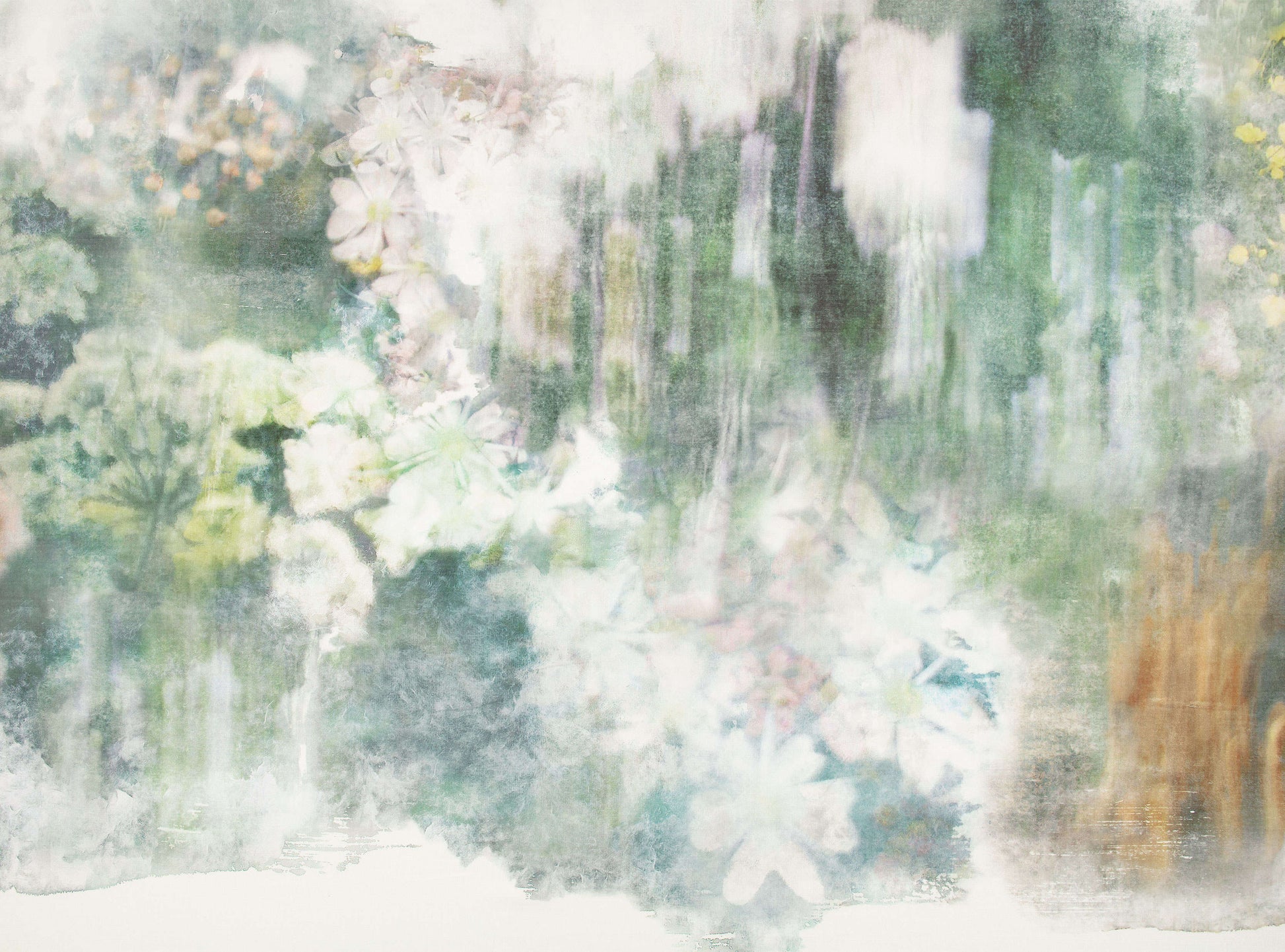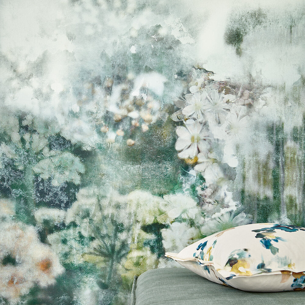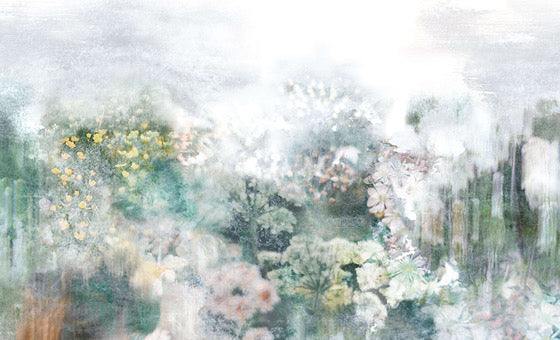 A captivating wall mural featuring a hazy dreamscape, created by a collage of photographic images of light bathed florals and spontaneous botanicals that merge to create a mesmerising scene. This vivacious mural captures the organic and wild spontaneous nature of growing vegetation and blossoming flowers.
