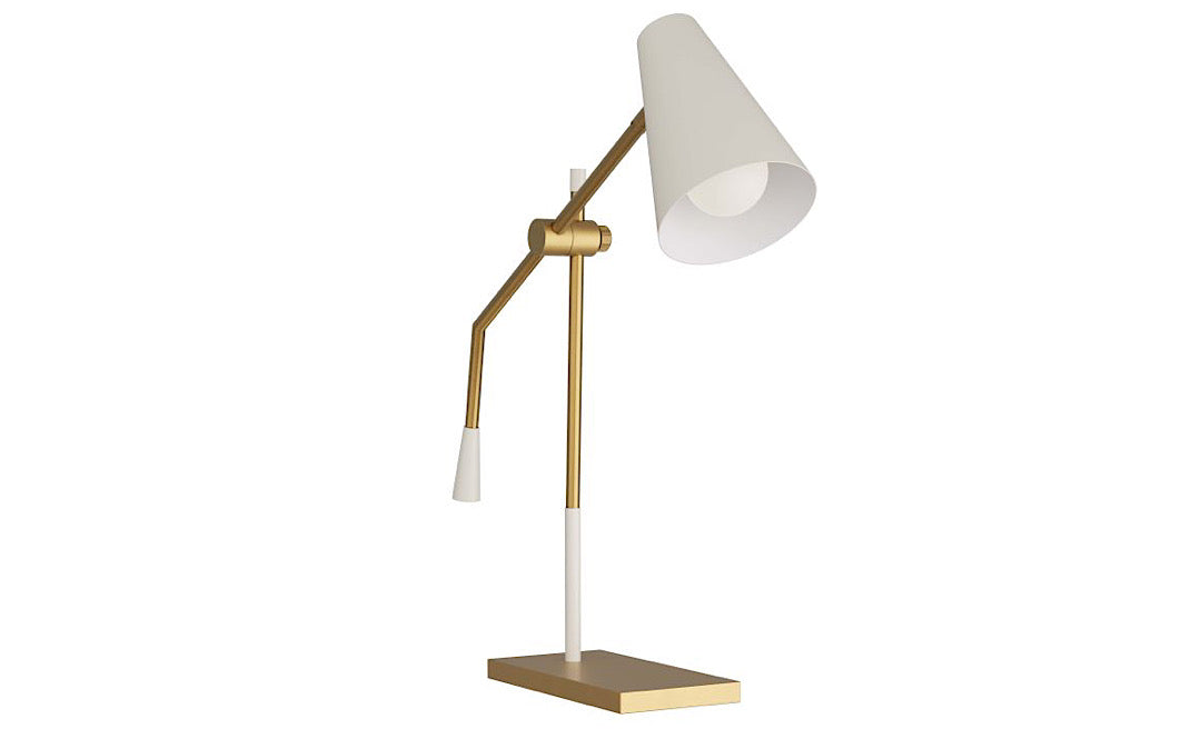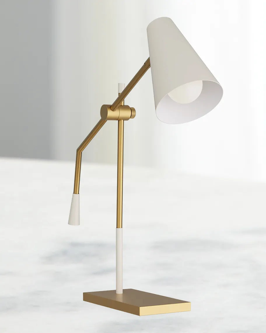 Our Wayne suspension task lamp is designed with a conical shade in matte cream enamel and an articulating brass steel arm. The mod illuminator is accented with matching cream enamel, which caps the end of the arm and encircles the lampβs tubular frame at the top and at the base. The shade pivots, casting directional light where you need it.Β