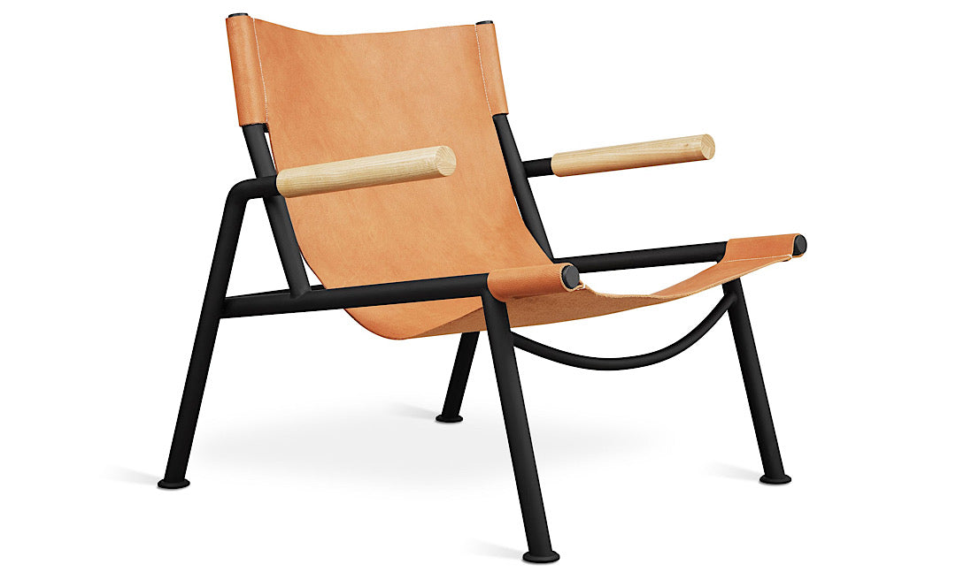 The Wyatt Sling Chair marries high-design with honest, raw materials to showcase an original design that’s engineered for comfort. Suspended over an ergonomic black metal frame with contrasting solid wood arm rests, the vegetable-tanned leather sling creates a sculptural shape that is infinitely inviting. Using age-old techniques and chemical-free, eco-friendly dyes, the tanning process results in a soft leather that cradles the body. Over time, the sling will darken and develop a distinctive, natural patina that adds to this chair’s singular charm. A versatile statement-maker, Wyatt is destined to be a household or workplace classic.
