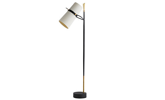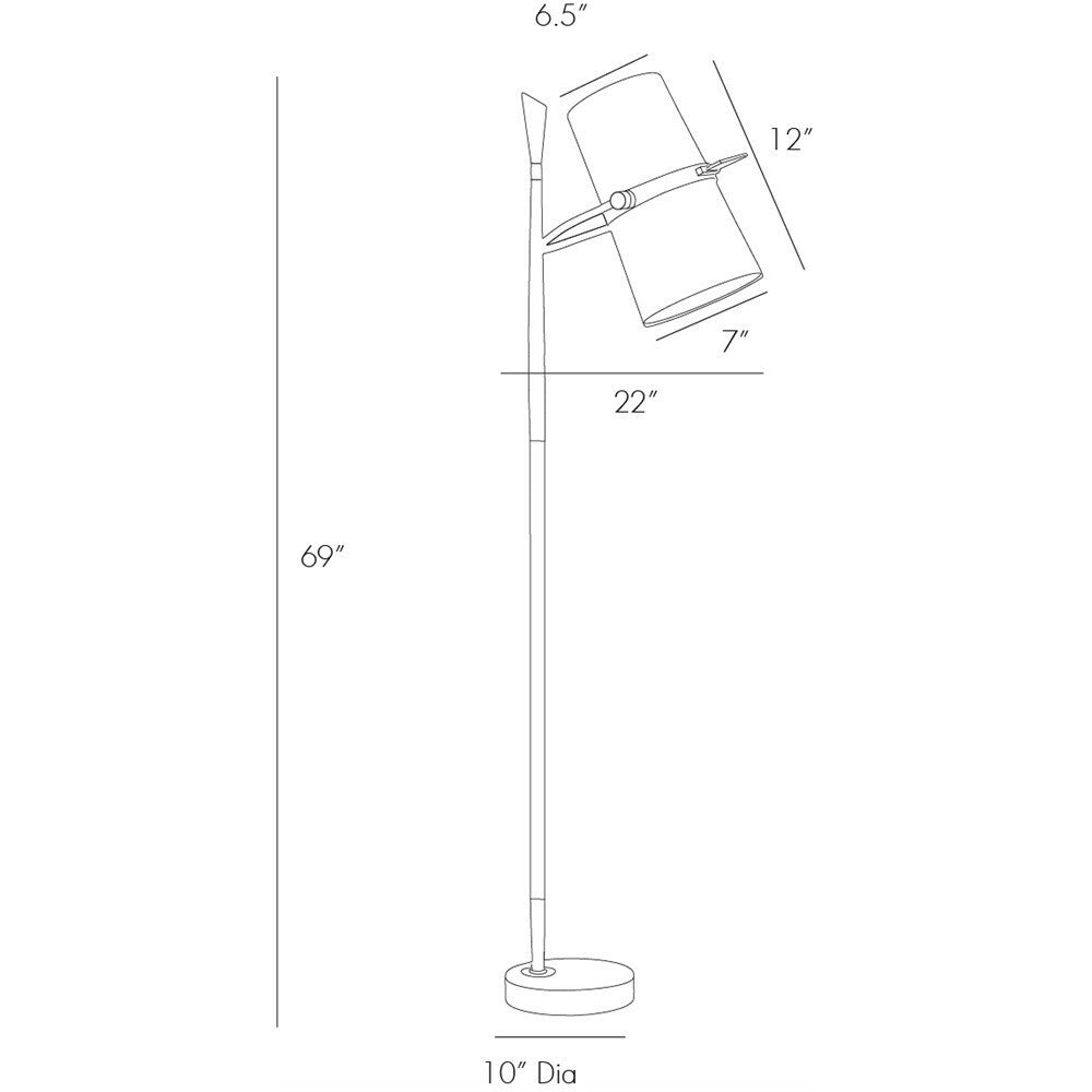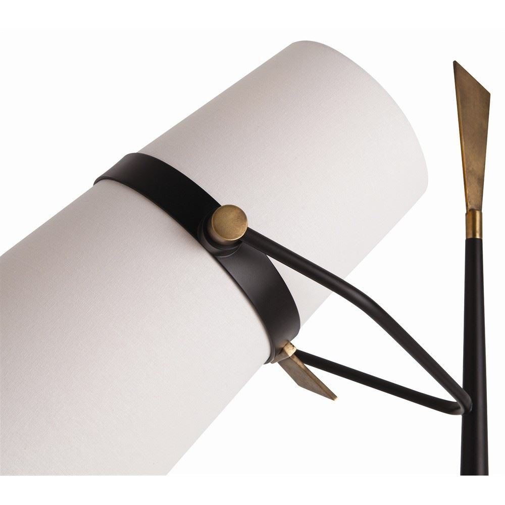 Modern floor lamp with a black iron tapered slender vertical rod and a blade shaped vintage brass finish finial. A white linen cylindrical double shade with off-white cotton lining allows for directing task lighting. Full range dimmer.