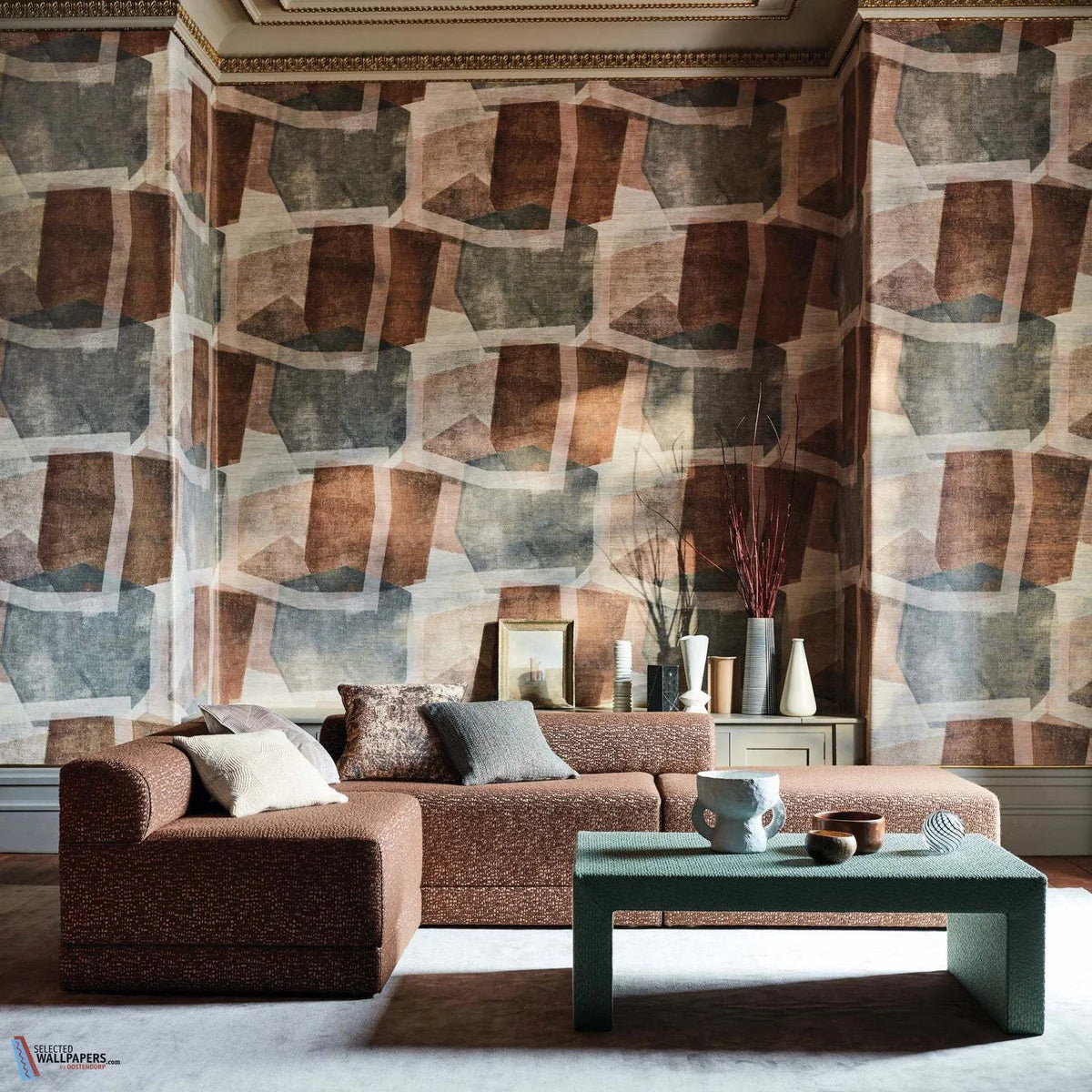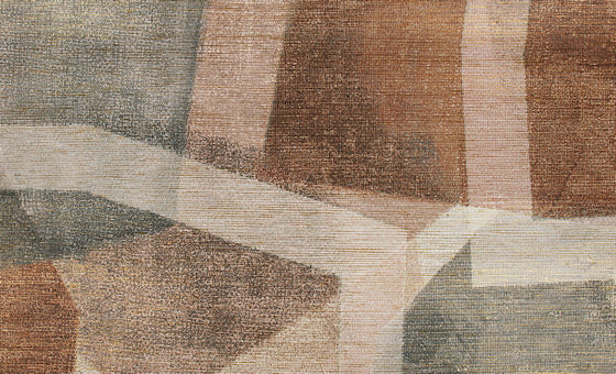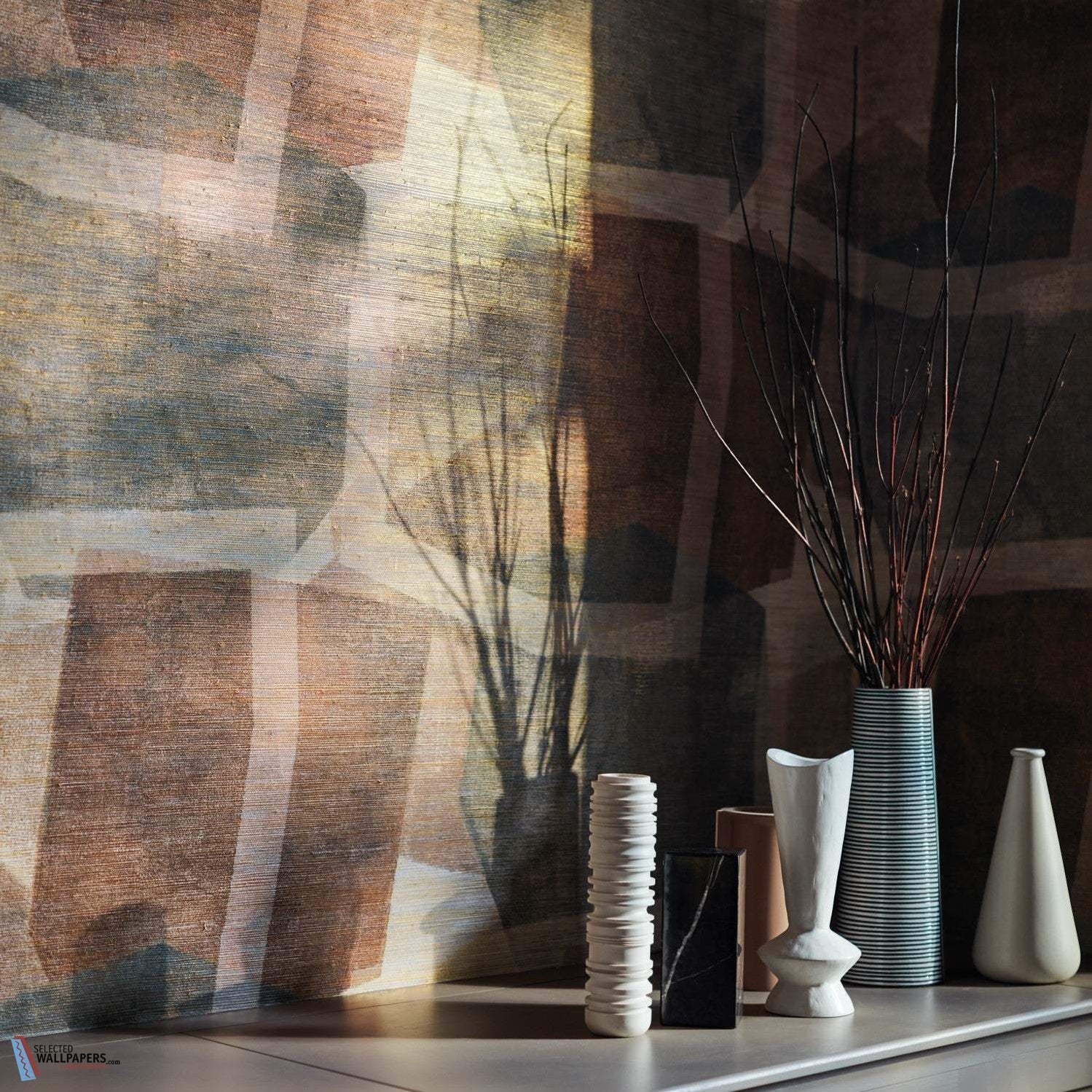 A fusion of rustic and lustrous elements; an arresting, painterly geometric is bold in pattern, colour, and texture, printed on natural, woven raffia that has been delicately positioned on a glimmering foil background.